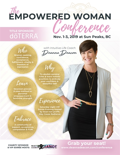 <p>3 Day Woman Empowerment Training Nov 1-3, 2019 at Sun Peaks Grand Hotel & Conference Centre TICKETS ON SALE: bit.ly/empoweredwomanconference Mission: To inspire, uplift, educate & motivate women with mindfulness & embodiment tools to live true to themselves, heal their bodies, nourish their minds and unleash their natural feminine wisdom and strength.In this 3-day Woman Empowerment training & experience, attendees can expect to laugh, dance, play, connect, share, grow & explore what it means to live true to their own inner Empowered Woman. Intuitive Life Coach & Speaker; Deanna Deacon, will be teaching a proven 6-step method to embody Feminine strength and live a life of authenticity, empowerment and confidence in all aspects of life – business, relationships, health & happiness.Our title sponsor is an incredible team of 4 powerful healers serving us through the healing wellness of therapeutic grade essential oils through doTERRA Oil Remedies. We are honoured to have these women hold space for each of you for this weekend: Karen Peterson Sonja Foss Yoga Kim E Clark-McKay Jillian MasonOur Charity Sponsor for this weekend is none other than May Cause Radiance ~ an incredible non-profit organization that supports young adults affected by CANcer. They are also the hosts of our Saturday Night VIP Soiree!!</p>