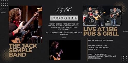 <p>TICKET HOLDERS FOR EVENT WILL GET PRIORITY RESERVATIONS FOR DINNER AT 1516 PUB AND GRILL PRIOR TO LIVE PERFORMANCE INCLUDES COMPLIMENTARY SHOW APPETIZER PLATTERSJack Semple grew up on a farm North of Regina, Saskatchewan. He started his musical career playing with various Regina based bands & later relocated to Toronto in the late 1980s to become the lead guitarist of The Lincolns, a popular funk, rhythm & blues band. He left the band after two years & returned to Regina to pursue a solo career & to spend more time with his family.After his move back to Regina, Semple contributed to television & music scores & appeared in the title role of Guitarman, a 1994 television movie. Semple also commenced a solo recording career that has resulted in the release of ten albums. In 1992, Semple came to national prominence through winning The Much Music “Guitar Wars” contest.Semple has been twice nominated, in 1999 & 2000, for a Gemini Award for his soundtrack work on the television series Incredible Story Studio. Semple won a Juno Award in 1991 for the Best Roots Recording. He has won two western Canadian music awards for “Qu’Appelle” & “In The Blue Light”.Semple continues to perform as a solo artist & with The Jack Semple Band, across Canada & now being championed across America!Jack Semple writes & performs “Modern Blues” without forgetting where he came from. He is an epic guitarist & soulful singer. His music is like Stevie Ray Vaughn meets James Brown meets Robben Ford.</p>