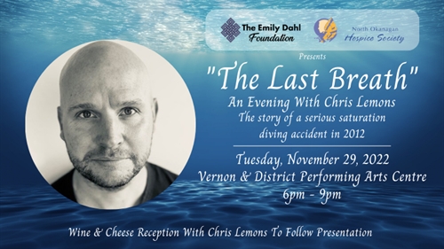 Chris Lemons’ story has been made into a documentary film. A North Sea diver cheated death after a catastrophic computer failure saw his boat drift away and his oxygen supply cut off. Chris Lemons lay almost 100m (about 300ft) under the surface, resigned to ending his days in the dark water.What is the purpose of this human life?We should live deeply so the time here doesn’t go to waste.We should not wait to answer this question.Come and support Chris Lemons and The Emily Dahl Foundation in any way that you can – with your energy and presence.Focus on the quality of life; not just living it to pass the days.The quality depends on how deeply we live each moment and not the emotional and material comforts. Money, power, prestige may not provide this quality or happiness.Wine & Cheese Reception With Chris Lemons To Follow Presentation