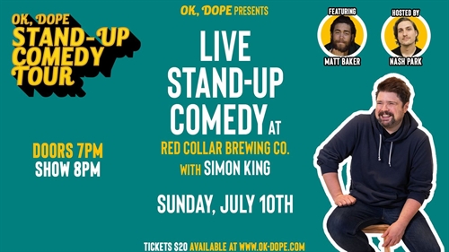 Doors: 7:00PM | Show: 8:00PM.Purchase tickets at: https://www.ok-dope.com/shows.OK, DOPE is proud to present one of Canada’s most seasoned comedians, Simon King, live at Red Collar Brewing Co. Sunday, July 10th. Featuring Matt Baker and Nash Park..FeaturingSimon KingMatt BakerNash ParkSimon KingSimon King completely changes a room when he takes the stage. Aggressive, truly insightful andpossessing a unique explosive delivery all his own, he bombards and challenges the audiencewith intelligent and flat out hilarious material at break neck speed. Along with his ability toseamlessly insert characters, impressions and improvisation makes him unlike anything else inthe stand up comedy world.Being the kind of comic that comes along maybe once in a generation gets you noticed. It wasn’tlong before he was being invited to play some of the world’s most prestigious comedycompetitions and festival. From his appearances at: the San Francisco International ComedyCompetition, the Seattle International Comedy Competition, The Winnipeg Comedy Festival, TheEdmonton Comedy Festival, The Moncton Comedy Festival, The Vancouver InternationalComedy Festival, Just For Laughs North West, The NW Comedy Fest, The Kuala LumpurComedy Fest, Virgin Music Festival and The Just For Laughs Festival to his breakoutperformances at the prestigious HBO U.S. Comedy Arts Festival in Aspen and the HBO, TBSComedy Festival in Las Vegas: he’s made a huge impact wherever he’s been.A workhorse and veteran performer with more than twenty years of professional stand up underhis belt, Simon effortlessly plays everything from theatres to comedy clubs to dive bars. Withnumerous national television and radio appearances including Comedy Network, CBC, CTV,TBS, Comedy Central and TBS among many more his resume speaks for itself. Simon hasreleased numerous albums that are regularly featured on Sirius and terrestrial radio and alsomultiple hour long specials including his latest “As Good As Or Better Than” directed by RoryScovel.Matt BakerYour guide to laughter, Matt Baker is an adventurous guy with a goofy outlook on the world he lives in. His unique brand of comedy is light, silly and witty! Matt hails from the suburbs of Ontario and has travelled across Canada telling stories and jokes in small towns and big cities alike. Winner of the Just for Laughs Northwest Outsider’s competition, Matt is a regular at Yuk Yuks and has performed at numerous festivals on the west coast! Matt Baker is a comedic act you won’t want to miss!Nash ParkNash Park is an up-and-coming stand-up comedian born in the small town in northern BC. After high school Nash moved to Victoria BC and spent years chasing creative projects until he discovered his love for stand-up comedy. After just one taste, he was completely hooked. Since then Nash has been regularly performing his high-energy, hard-hitting stand-up to crowds all around Victoria and Vancouver Island. Nash is also behind OK, DOPE, a comedy collective that creates and produces live shows, podcasts, and comedic content. OK,DOPE’s flagship production is The Late Night Show with Nash Park, a live monthly show that combines stand-up, improv, and sketch all within the structure of a classic late night talk show. Off stage you can hear him as one half of the OK, DOPE Podcast.