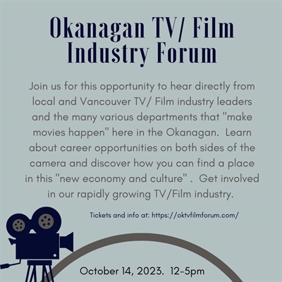 <p>The Okanagan region is experiencing an unprecedented surge in film andtelevision production, and to harness the immense potential of this growth, we are thrilled toannounce the Okanagan TV/Film Industry Forum. This unique event, designed to connectcreative professionals, businesses and enthusiasts, will take place October 14, 2023 12-5pm <br />The Okanagan TV/Film Industry Forum is a collaborative initiative designed to inform thecommunity of the tremendous positive impact that this rapidly growing industry has on ourlocal economy, businesses and employment. It will also offer an in depth look at careeropportunities on both sides of the camera and how to best get started or advance in theindustry. <br />Attendees of the forum will have the opportunity to hear directly from, and connect with longtime industry leaders. They will hear the engaging career journeys of these leaders and gaininsights, advice and guidance from those who have successfully navigated this dynamic industry.They will also learn about the diverse and captivating locations, local talent resources andproduction capabilities as well as local educational resources and opportunities. <br />As well, they will have a chance to network with these panelists and with fellow filmmakers,actors, technicians, film enthusiasts and local business leaders while creating new relationshipsand exploring the local film community. <br />The forum will culminate with a wide-open Q and A session for the panelists and will divedeeper into the conversations and resources so that everyone attending can leave with as muchknowledge as possible. <br />The Okanagan TV/Film Industry Forum promises to be an invaluable event for professionals,talent, students and anyone passionate about this industry and our community. It is also anexcellent opportunity for local business owners to understand the economic impact and whatsupport services are needed as the industry grows locally. It is our mission to foster a thrivingfilm and television community in the Okanagan by providing a platform for CONNECTION,COLLABORATION AND GROWTH. <br />Don’t miss this opportunity to be a part of the ever-expanding film and television industry.October 14, 2023 12-5 pm, Kelowna Film Studios 100-1516 Keehn Rd. Kelowna, BC <br />For more information and tickets, visit our website: h??ps://oktvfilmforum.com/ <br />The Okanagan TV/Film Industry Forum is a platform dedicated to promoting, supporting anddeveloping the film and television industry in the Okanagan region. By facilitatingconnections, providing resources and fostering collaboration, the forum aims to help positionthe Okanagan and surrounding regions as a premier destination for film and televisionproduction.</p>