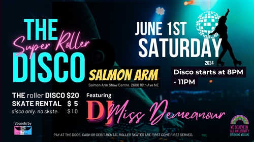 <p>The Super Roller Disco is coming back to Salmon Arm! 2024! <br />We had so much fun last year! Make sure you’re there again! <br />Saturday, June 1st! <br />Spread the word! Everyone is invited!! <br />Bring your friends, bring your family, make it a date!! Spend the night roller disco dancing at The Super Roller Disco! <br />Live beats bought to you by the infamous DJ Miss Demeanour! <br />Feel the beat! Roll and groove to the music! <br />SATURDAY, June 1st at the Shaw Center. <br />Disco starts at 8pm – doors open at 7:30pm <br />come early to get your wheels on before the Disco starts! <br />Need some encouragement? We are here to help! <br />Roller Disco Entry $20 <br />Skate Rental $5 <br />We have 150 pairs of rental roller skates + people are welcome to bring their own, rollers skates or roller blades welcome! <br />Disco entry only, live entertainment, no skating $10</p>