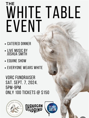 <p>A most magical evening with horses, dining and live music! Dress in WHITE and experience the Okanagan’s most unique event. Admission includes Appies, Dinner and dessert by Gumtree Catering, Beer from Okanagan Spring, Wine by SWBW, Live Music by Joshua Smith, Art Auction and Equine demonstration. There will be Insta worthy photo stations and sparklers to end the evening! ONLY 100 TICKETS! <br />This event is a Fundraiser for the Vernon District Riding Club. All proceeds will go towards facility upgrades.</p>