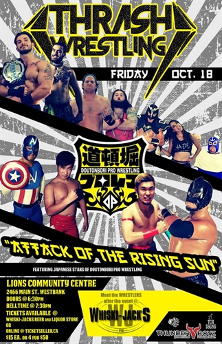 Making their return to Thrash Wrestling, stars from Osaka based Doutonbori Pro Wrestling prepare for a war!Led by the legendary Asian Cooger, what we have here is an international affair to be dealt with by unpredictable mayhem that only Thrash knows best!Tickets are $15 or 4 for $50 and are available at the Whiski-jack’s beer and liquor store or online at Ticketseller.ca $20 after door time.Don’t forget to join us after the show where you can meet the wrestlers at Whiski-Jack’s bar and grill!