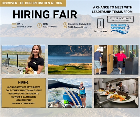 <p>Be a part of something BIG! <br /> Join us on Saturday, March 2nd at The Black Iron Club & Grill at Tobiano for a Hiring Fair from 1:00 – 4:00pm. <br /> Attendees will get a chance to explore job opportunities while meeting with leadership from Tobiano Golf Course, The Black Iron Club & Grill, and Bruker Marina. <br /> Available positions include: <br /> Outside services attendants <br /> Golf course maintenance staff <br /> Beverage cart attendants <br /> Servers & bartenders <br /> Kitchen staff <br /> Marina attendants <br /> Please have your resume available.</p>