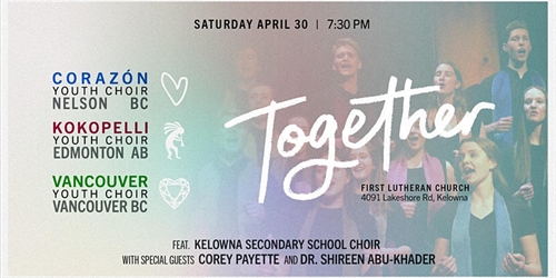 Vancouver Youth Choir, Kokopelli, and Corazón Vocal Ensemble present an unforgettable evening of choral music!About this eventVancouver Youth Choir, Kokopelli, and Corazón Vocal Ensemble present “TOGETHER”. An unforgettable evening of choral music with renowned guest clinicians Corey Payette and Dr. Shireen Abu-Khader. Featuring a special guest performance from Kelowna Secondary School Choir.Saturday, April 30th, 7:30pm, at First Lutheran Church (4091 Lakeshore Rd, Kelowna).Tickets are $20Join us for this long-awaited chance to hear joyful voices lifted together in song!PLEASE NOTE:We kindly request that masks be worn at all times by all patrons at this event.We strongly encourage that all audience members be fully vaccinated against COVID-19, as singing remains a higher-risk activity for spread of COVID-19.