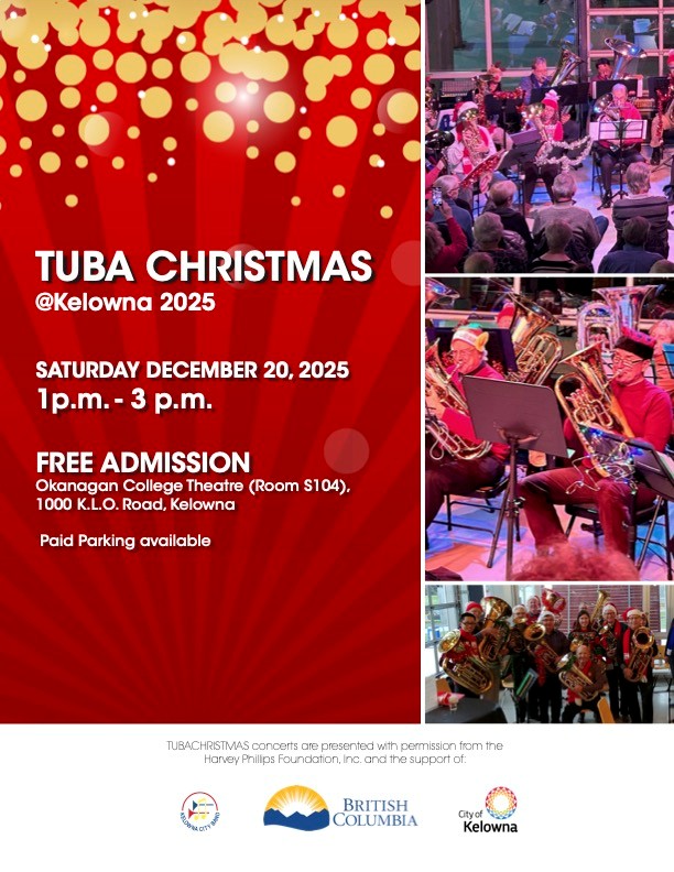 Proudly supported by the Kelowna City Concert Band, which has generously backed Tuba Christmas for many years, this concert is free for the community to enjoy. Bring your family, invite your friends, and enjoy an afternoon filled with Christmas spirit, joyful music, and community cheer.