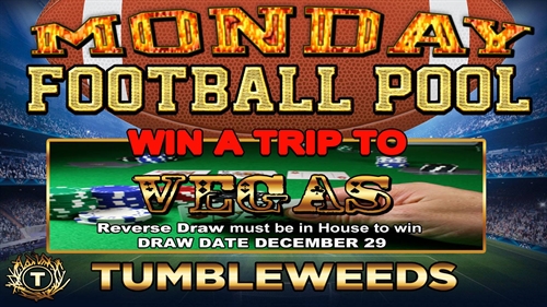 Tumbleweed’s Touchdown Football Pool 250-573-5502-$10.00 Weekly-$170 Club members pre-buy in for the year-Have your weekly pics is by Saturday at 11pmWEEK 1 I Will Need Both Monday Games points for tiebreakers-Pool Members also receive 15% off Regular priced menu items (With min beverage purchase)Drop in weekly players are welcome!-There will be Thursday Games for Week 13 Sheets but no other Thursdays included -Sheets are $10 with no limit-Must have Name/number and Be completed by 11pm saturday-All football picks will be posted by 10 am sunday-Winner takes 50% of pot with the remaining 50% going to year end points total. So don’t miss a week!-$170 Club Members will be able to use online system to enter in their own picks250 573 5502