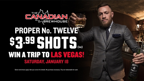 Join us for UFC 246 this Saturday to watch McGregor take on Cowboy! We will be giving away chance to win a trip to Las Vegas at 10:00pm (PT)!ALL DAY on January 18th we will have $3.99 Shots of Proper No. Twelve on special! All Canadian Brewhouse Locations.How to enter?Just show up to our house to watch UFC 246!On Special All Day:$3.99 Shots of Proper No. Twelve – 1oz (ALL DAY)