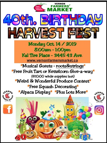 What a better way to celebrate our 40th Birthday then with a Harvest Fest. And on Thanksgiving Day to boot.Take in the Weird & Wonderful Produce Contest and vote for a chance to win “Market Bucks”. If you have something weird from your garden that you would like to contribute, please bring it along.Musical Guests roots & strings. Free fruit tart and Kettlecorn give-a-way at 10:00 (while supplies last) FREE Colouring and Squash decorating booth, Alpaca Display with real alpacas, plus everything you LOVE and are THANKFUL for about the Market! Fresh Fruits & Veggies, Artisan Wares, Wine, Delicious Baking, Ethnic foods and more. Stay tuned on Facebook for more Birthday Party surprises!