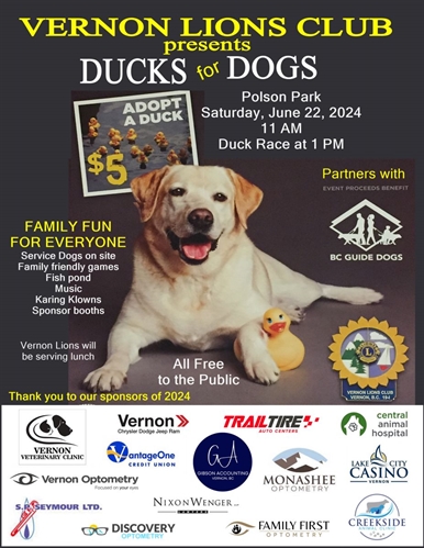 <p>Our fourth annual duck race and family day is June 22 at Polson Park from 11:00 AM to 2:00 PM. The event is free to attend. There will be entertainment, games for children, BC & Alberta Guide Dogs will provide a Guide dog to take people through a maze to experience what it would be like to be blind, a BBQ lunch can be purchased on site throughout the day. The duck race will be at 1 PM in the Vernon Creek at Polson Park. <br />The prizes for the race are as follows: 1st Duck to cross the finish line is $1,000, 2nd Duck is $500, 3rd Duck is $250 and the Lame Duck (last one to cross the finish line) is $100. <br />We are asking the public to support this cause by purchasing tickets at our booths in the grocery stores of Vernon/Coldstream. We will be on location rotating stores from March 22 to June 21 from 10:00 AM to 4:00 PM.</p>