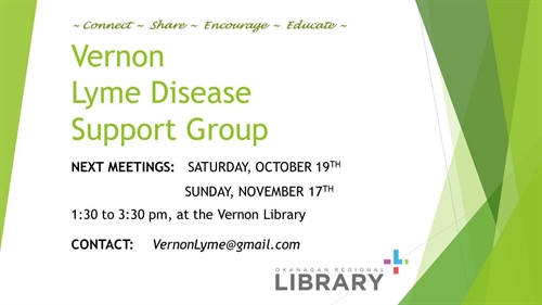The Vernon Lyme Disease Support Group meets monthly at the Vernon library to provide support and education for those afflicted with the disease and family members as well. It is moderated by Merina Brisdon, responsible for founding and facilitating the same type of group in Victoria. This is a free drop-in program open to all. For more information, please email vernonlyme@gmail.com