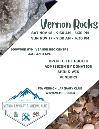 For all those who have a fascination with rocks, crystals, and treasure hunting, come check out Vernon Rocks! Presented by the Vernon Lapidary and Mineral Club, this event will showcase rocks, minerals, crystals, gems and jewelry for sale. 10 + vendors registered!