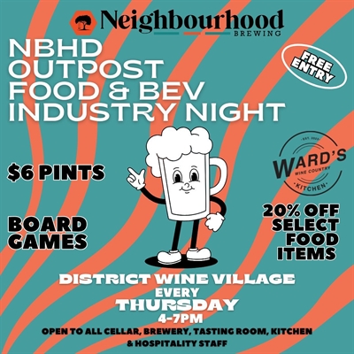 <p>The Neighbourhood Outpost in the District Wine Village is hosting a Food & Beverage Industry Night every Thursday!4-7pm every week for $6 pints, board games and food specials from us Wards Wine Country Kitchen. <br />Industry Night is open to all cellar, brewery, tasting room, kitchen and hospitality staff! See u soon!</p>