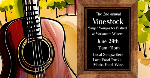 The 2nd annual Vinestock Festival is happening June 29th at Marionette Winery and we’ve got an amazing day of original music planned for you. Local singer songwriters, local food trucks and local wine all come together on the Marionette Winery patio for one day from 11am-11pm.