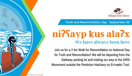 <p>Healing starts with us <br />Join us for a 2 km Walk for Reconciliation on National Day for Truth and Reconciliation! We will be departing from the Safeway Parking lot and making our way to the SIRS Monument outside the Penticton Hatchery on En’owkin Trail. <br />Please Note: Please attend walk at your own risk, the ONA is not responsible as this is a public event. We will have lunch at the monument but priority will be given to Syilx IRS Survivors, Syilx elders and nation members. <br />Walk is open to everyone. Remember to wear your orange, blue, or green shirts!</p>