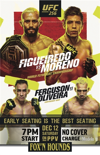 Watch the World Flyweight Championship: Figuereido vs. Moreno for FREE. Also playing: The LightWeight Bout with Ferguson vs. Oliviera. Enjoy great food and drinks at the Pub! Arrive early to reserve the best seats.