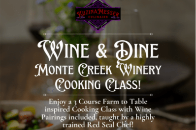<p>Enjoy a 3 Course Farm to Table Inspired Cooking Class that comes with 3 glasses of paired Monte Creek wine!</p>