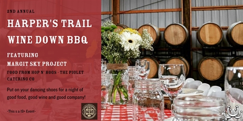 Join us for the 2nd annual Wine Down BBQ on August 24 from 6 pm -11 pm! Put on your dancing shoes and get ready for an unforgettable evening! Our BBQ last year was so much fun we had to do it again!Music by Margit Sky Project! And food by Hop N’ Hog’s – The Piglet Catering Co.Tickets are $65 + tax and include a full pig roast dinner, 2 drink tickets (choice of either wine or Iron Road beer) and a Harper’s Trail GoVino glass.-This is a 19+ Event only!- No outside alcohol permitted.
