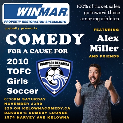 <p>Join us for a hilarious night as Winmar Property Restoration Services presents Comedy for a Cause for Girls Soccer, featuring the incredible Alex Miller and friends! This special event takes place on Saturday, November 23rd, at 6:30 PM at Dakoda’s Comedy Lounge. Alex Miller, known for his performances at the Kelowna Comedy Festival and shows across Canada, will lead an unforgettable evening of laughs, with 100% of ticket sales going directly to support girls’ soccer. Don’t miss this chance to enjoy great comedy while contributing to a fantastic cause!</p>