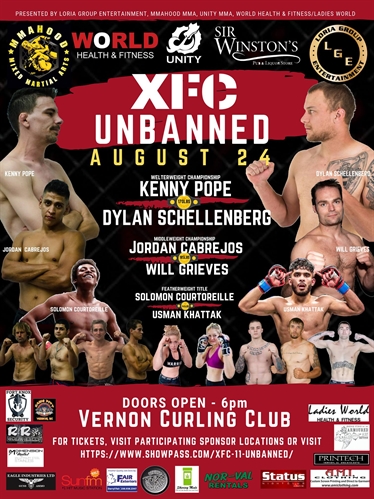 XFCE Unbanned is coming to Vernon, BC.August 24th! Doors open at 6pm.Hosted at the Vernon Curling Club.Tickets start at $40. 20 fights have been scheduled for this event.Head sponsors: -Sir Winston’s Pub and Liquor Store-World Health and Fitness / Ladies WorldLocal Sponsors:-Printech-Fair siding-Eagle Industries -Freedom Tattoo-On the Roxx-AMI Clothing-NorVal-Sharing Meds-Fort Knox Security-R&R Concrete.
