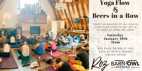 Our first of 2020! Let’s ring in the New Year with 60 minutes of all-level flow yoga with Roz and enjoy a post-practice flight or pint of Barn Owl beer (or Kombucha, coconut water or wine!) amidst great company in the loft. Hope you can make it!!!xxRoz + the Barn Crew