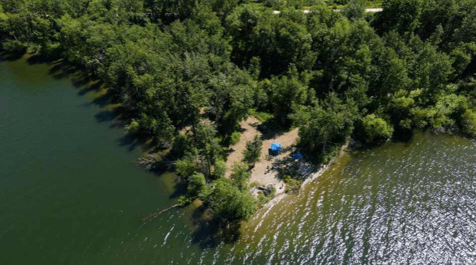 That includes 1327 feet of lakeshore frontage on Wood Lake, two separate one-acre building sites at the top of each parcel, and a potential building site by the water.