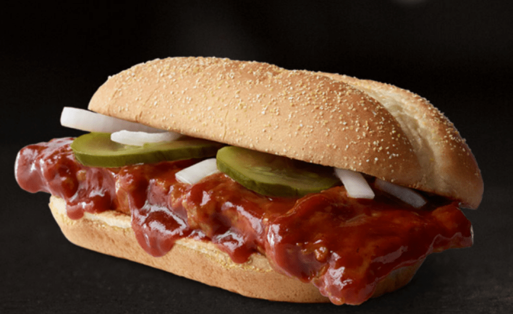 The McRib is made up of a boneless pork patty covered in BBQ sauce accompanied by pickles and onions and served on a bun. Some say it's the perfect mix between sweet, tangy and savoury flavours.