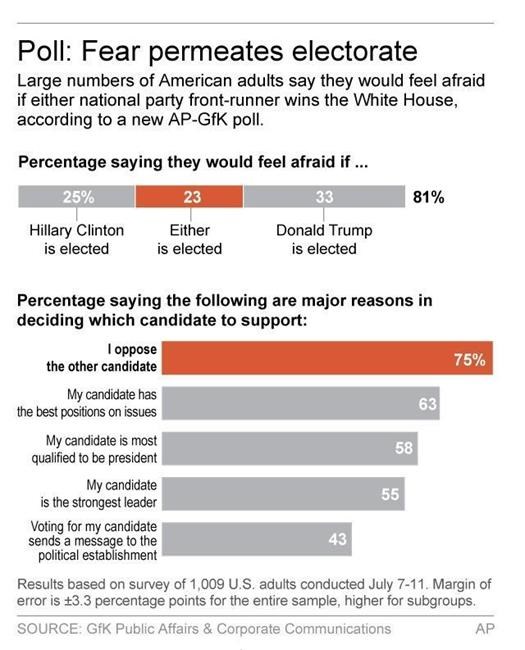 Eighty-one per cent of Americans say they would feel afraid following the election of one of the two polarizing politicians, according to a new Associated Press-GfK poll. That includes a quarter who say it doesn’t matter who wins: they’re scared of both.
