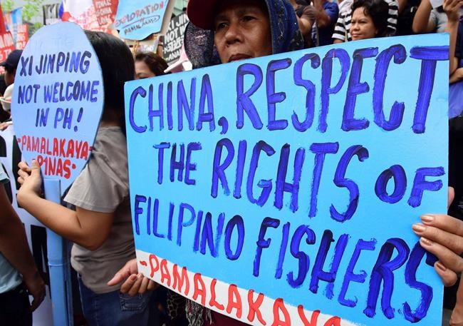 More than 300 protesters with placards reading “Hands off our land and seas” rallied in front of the Chinese Consulate in Manila. Another group of protesters later burned mock Chinese flags near the presidential palace, where Xi and Duterte met.