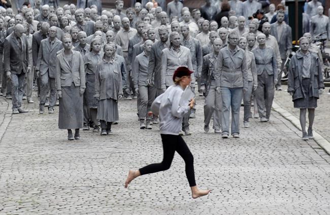 A protest on Wednesday featured hundreds of people painted as clay figures — meant to represent a society that has lost its belief in solidarity — shedding their grey costumes.