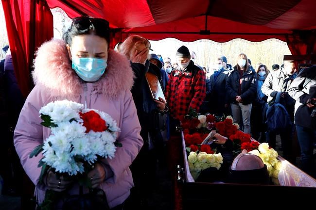 Mourners on Friday stood outside the church holding photos of Bandarenka and the red-and-white ribbons that are an opposition symbol. They later formed a kilometres-long (miles-long) column to walk to the cemetery where he was buried.
