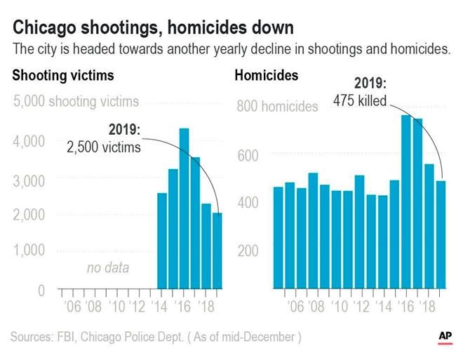 The shooting comes as the city has been on the verge of closing out 2019 with sizable drops in shootings and homicides for the third straight year. Through roughly mid-December, about 475 people were killed, compared with 549 in 2018, which is a 14% drop. In 2016, the number of homicides was roughly 750, according to Chicago police data.