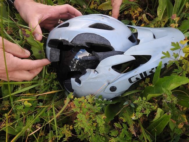 It says the man has injuries to his stomach and leg, but his head was protected even though the bear bit right through his helmet.
