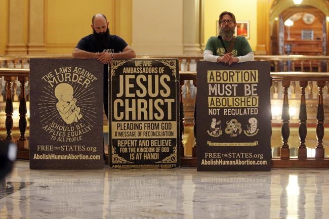 The two Statehouse protesters, Clifton Boje and Kevan Myers, from the Kansas City, Kansas, area, had signs calling for banning abortion and describing themselves as “ambassadors of Jesus Christ.”