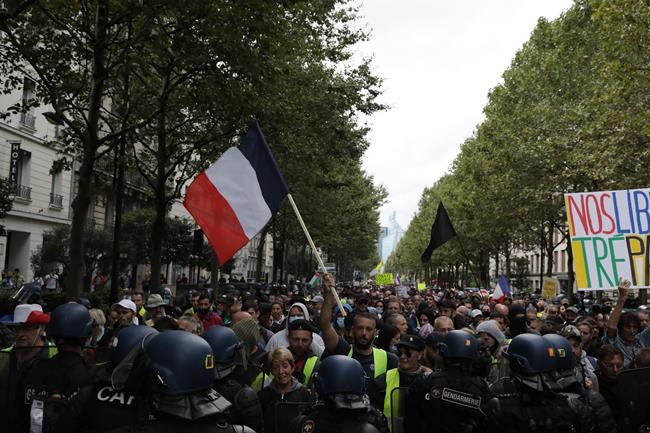 With French riot police on guard, a largely peaceful crowd walked across Paris carrying banners that read: “Our freedoms are dying” and “Vaccine: Don’t touch our kids.” Some were also upset that the government has made COVID-19 vaccines mandatory for health care workers by Sept. 15.