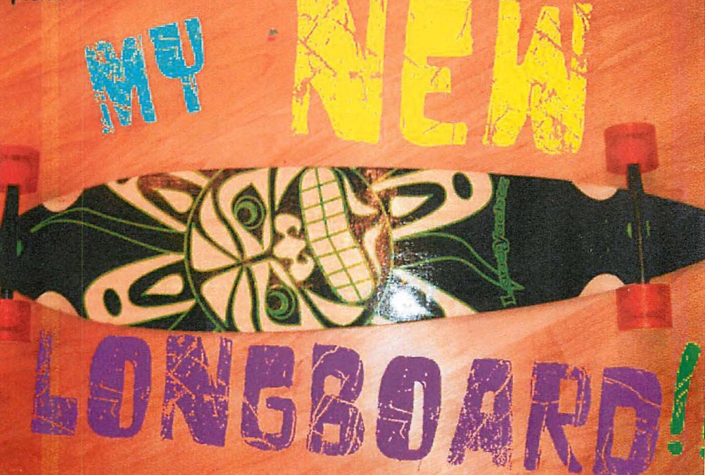 What they hope to find now is the woman's long board. It's a Landyachtz Bamboo Pinner decorated in an aboriginal style with a green and black face on the bottom. The top is a natural colour with a blue and green sticker placed near the back.