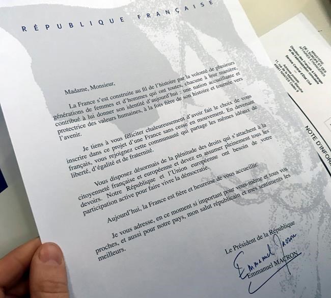 The new citizens proudly clutched French birth certificates, excerpts from the French Constitution and a signed letter from French President Emmanuel Macron saying, “France is proud and happy to welcome you.”