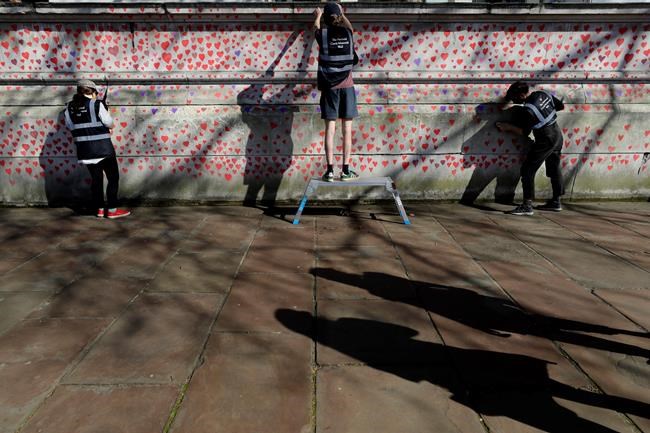 Families who lost loved ones have started painting a mural made up of almost 150,000 hand-drawn hearts on the south bank of the River Thames in London opposite the Houses of Parliament to remember those who have died. The mural is expected to stretch more than a half-mile (nearly a kilometre) when finished.