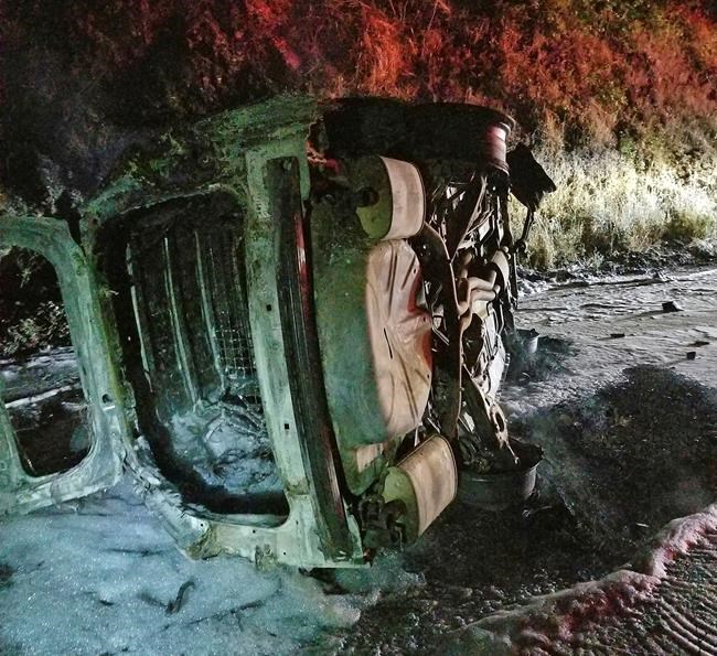 The bear smashed the hood and windshield. The patrol car hit an embankment, rolled onto its side and burst into flames.
