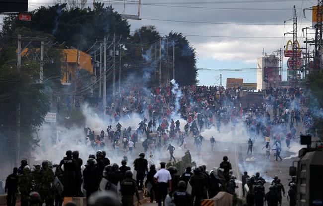 The inauguration came after soldiers and riot police fired tear gas to block thousands of demonstrators from marching to the National Stadium to protest. Masked protesters shot rocks from slingshots and kicked canisters back toward security forces as barricades burned and gas billowed on the streets.