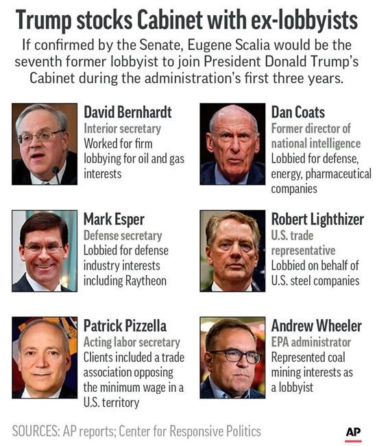 Former lobbyists run the Defence and Interior departments, Environmental Protection Agency and office of the U.S. Trade Representative. The acting Labor secretary, Pat Pizzella, is an ex-lobbyist and Trump’s pick to run the department, Eugene Scalia, also is an ex-lobbyist. Scalia’s confirmation hearing before a GOP-controlled Senate committee is scheduled for Thursday and Democrats are expected to grill him on his long record of opposing federal regulations .