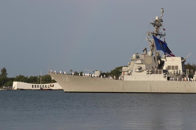 Sailors aboard the USS Daniel Inouye stood along the rails of the guided missile destroyer while it passed both by the grassy shoreline where the ceremony was held and the USS Arizona Memorial to honor the survivors and those killed in the attack. Ken Stevens, a 100-year-old survivor from the USS Whitney, returned the salute.