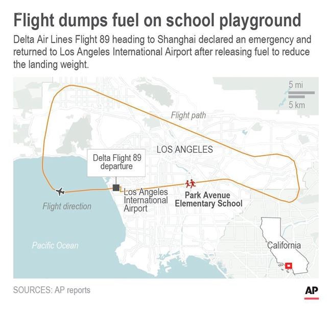 LOS ANGELES – Some aviation experts said Wednesday that they were puzzled after the crew of a commercial airliner decided to dump fuel at low altitude during an emergency landing, causing a vapour to fall on schoolyards and neighbourhoods east of Los Angeles International Airport.