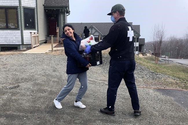 At Vermont’s Jay Peak, employees wearing protective face masks and clothes deliver groceries once a week to the now 23 stranded workers, giving them gloves and masks to wear during the exchange.