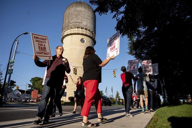 Dozens of faculty members began picketing Sept. 7 at the school, about 35 miles (56 kilometers) southwest of Detroit.