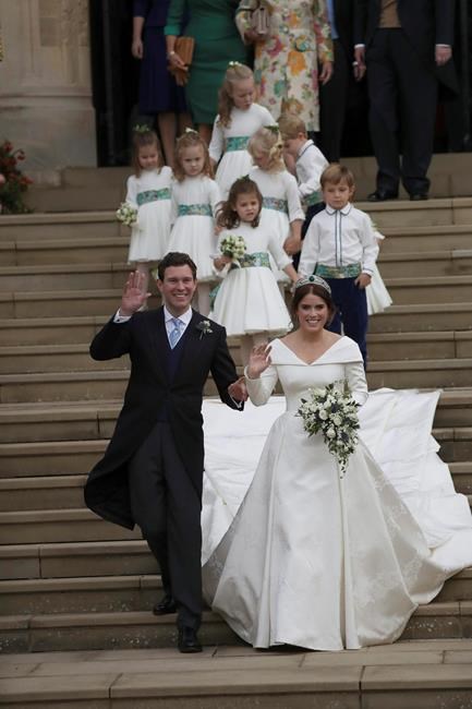 Eugenie’s dress was cut in a deep V in the front and the back, a feature requested by the bride that revealed a vertical scar from her surgery at age 12 to correct scoliosis. She has said previously it’s important for people to show their scars.