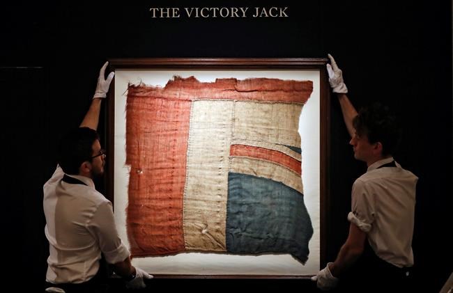 LONDON – Sotheby’s auction house says a fragment of the red, white and blue “Victory Jack” flag that flew from Adm. Horatio Nelson’s flagship during the Battle of Trafalgar has sold for 297,000 pounds (around $408,000).
