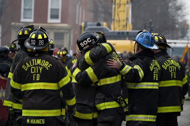 The Baltimore City Fire Department said in a tweet that firefighters were responding to a blaze at the three-story rowhome when the four were trapped inside. Crews removed piles of debris to locate the firefighters, the department said.