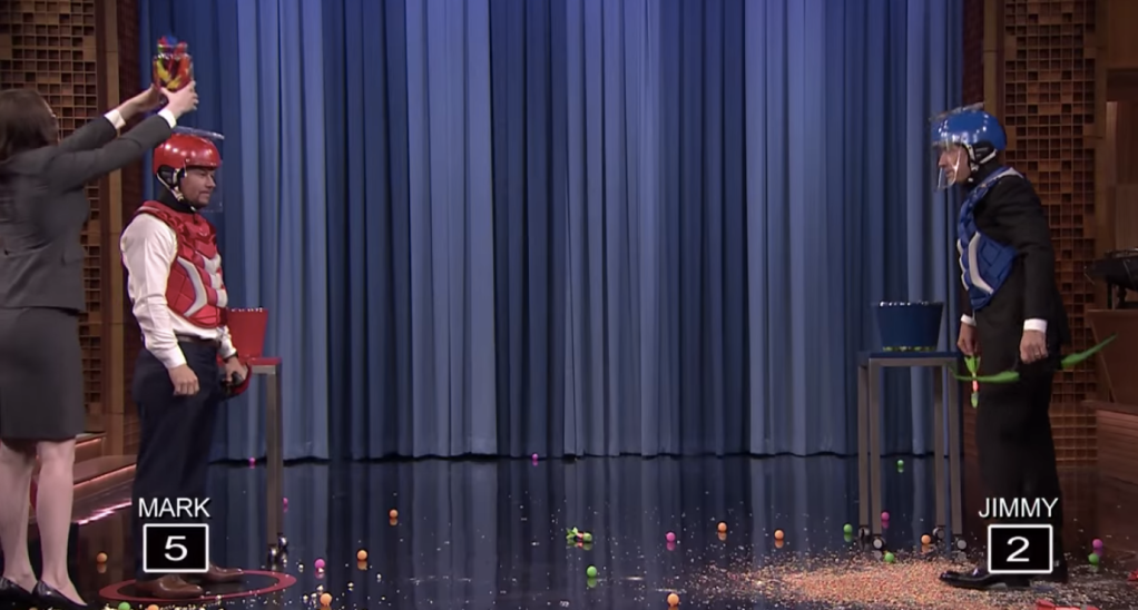 Watch Fallon shoot things off of Mark Wahlberg's head in today's trending now